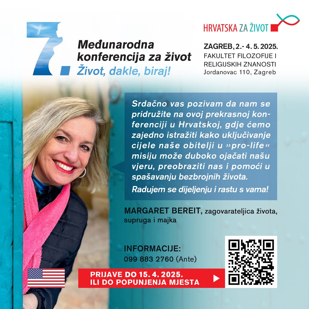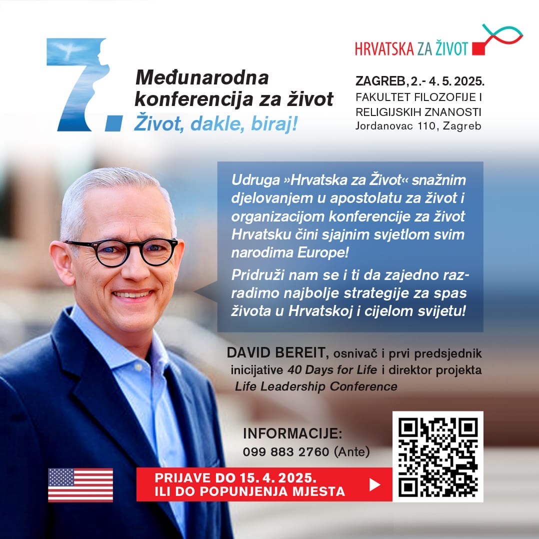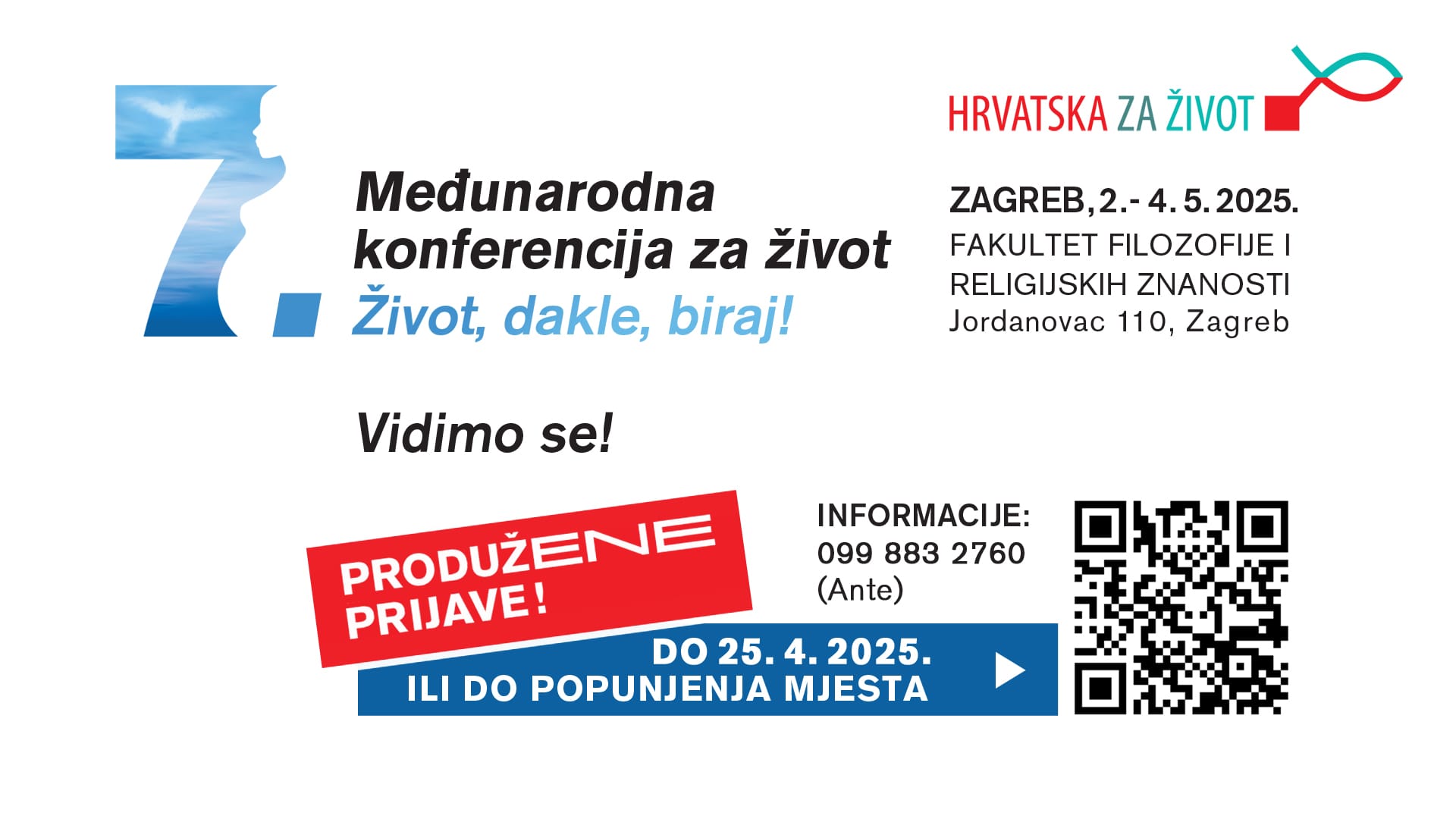 ispred vas je prijavnica za 7. međunarodnu konferenciju za život “Život, dakle, biraj” koja će se održati u Zagrebu, u dvorani Antuna Bauera, Fakultet filozofije i religijskih znanosti, Jordanovac 110 od 2. do 4. svibnja 2025.
