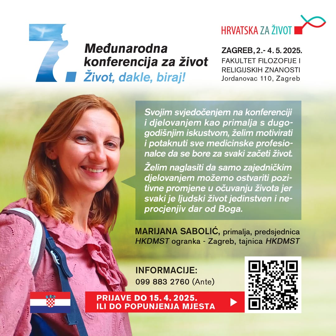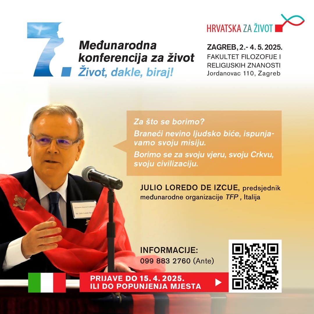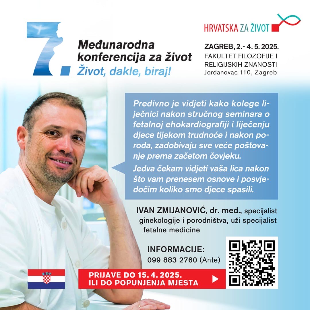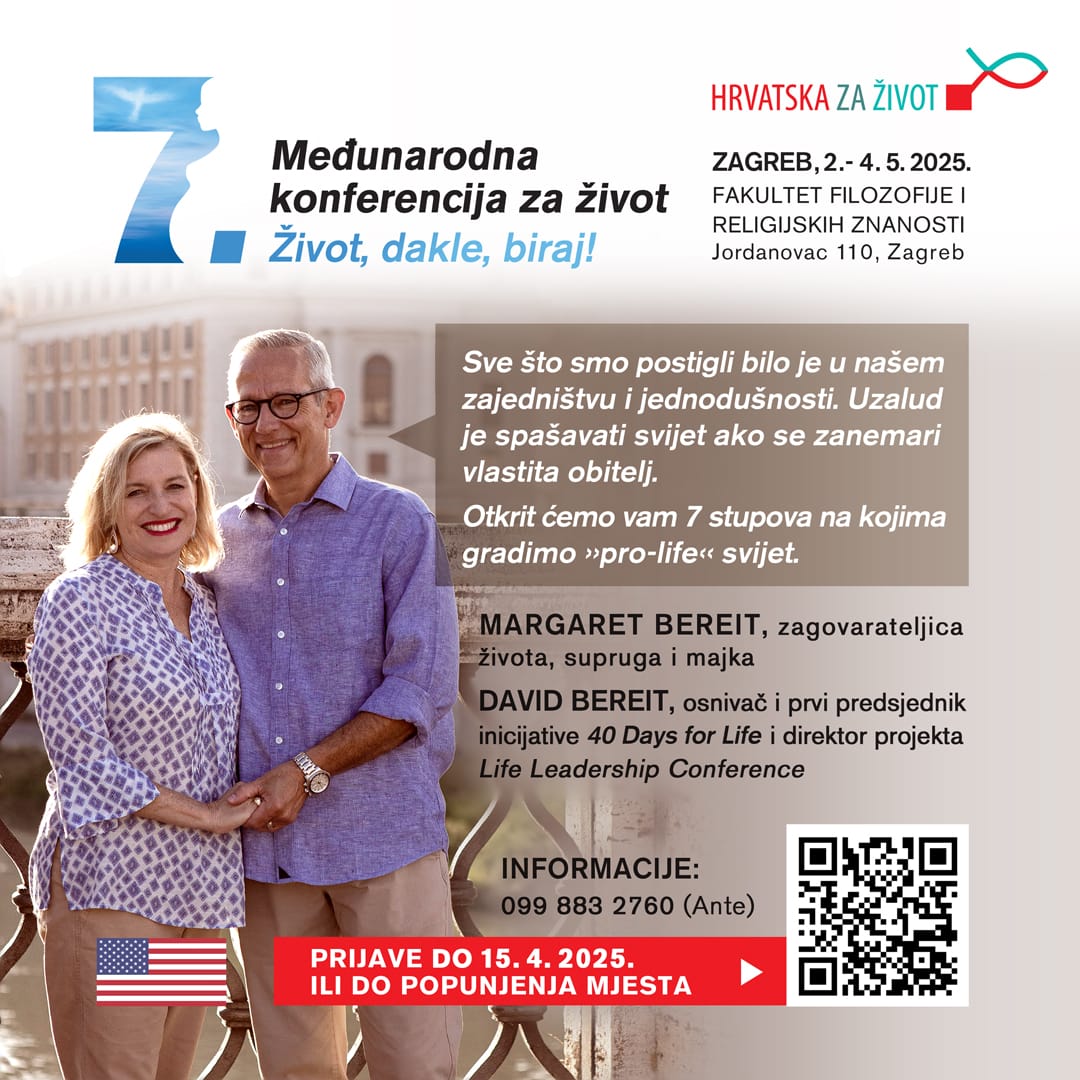 ispred vas je prijavnica za 7. međunarodnu konferenciju za život “Život, dakle, biraj” koja će se održati u Zagrebu, u dvorani Antuna Bauera, Fakultet filozofije i religijskih znanosti, Jordanovac 110 od 2. do 4. svibnja 2025.